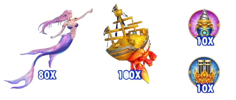 ⬅鑽頭砲:可以獲得基本倍率十倍的講今,並額外獲得一個免費的鑽頭砲,發射之後有機會捕獲路徑上任何一種魚種。